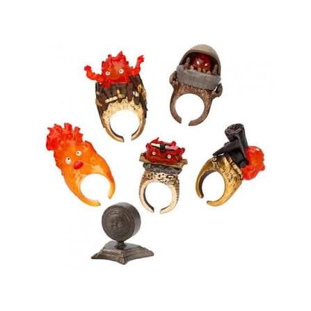 Each ring features a different pose or scene with Calcifer, with a total of six types in a complete set, including one secret design. The rings come with a stand modeled after the fireplace in Howl's castle.
